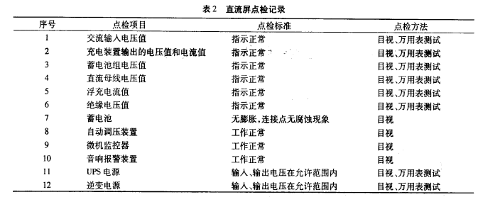 首要需求編制點檢規范,編制出符合實際出產需求的點檢規范,使其他點檢者能快速、簡潔執行點檢規范。點檢規范的內容觸及方面比較多,列入點檢辦理規模的部位也比較多,例如直流屏,溝通輸入電壓值、充電裝置輸出的電壓值和電流值、蓄電池組電壓值、直流母線電壓值、浮充電流值、絕緣電壓值、蓄電池、自動調壓裝置、微機監控器、音響報警裝置、UPS電源、逆變電源等都是關系到直流屏安全運轉的重要參數及裝置,確定為點檢部位。點檢部位確定后,就要落實點檢內容,點檢辦法目前還是以簡單東西、儀器和人的感觀為主的點檢辦法。因而,點檢內容首要是查看設備溫度、電壓、表計指示、工作狀況等方面參數。直流屏設備點檢工作首要是以日常點檢為主,定時點檢為輔。日常點檢首要以人的感官為主,經過聽、摸、看.擰等辦法對運轉中的設備進行一個外觀的查看。經過每日進行的點檢工作,及時發現設備存在的危險并消除,使設備長周期安全運轉。由于直流屏的特殊性,展開的直流屏設備專業點檢也很重要,點檢辦法以工用具、外表和人的感觀為主的點檢辦法。經過定時進行的點檢工作,及時發現設備存在的危險并消除,使設備長周期安全運轉,見表2。