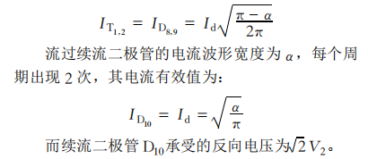 加了續(xù)流二極管后其輸出電壓波形V3與不加續(xù)流二極管時(shí)相同。原先流經(jīng)橋臂上元件的續(xù)流電流變成通過二極管續(xù)流。各原件中流過的電流波形和變壓器副邊電流波形明顯有一定的間隔。每個(gè)周期中流過晶閘管T1、T2、D8、D9的電流波形寬度都是π—α,其電流有效值為(Id為負(fù)載電流)