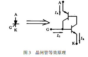 晶閘管的結(jié)構(gòu)相當(dāng)于串級(jí)雙晶體管模型P一N一P一N4層結(jié)構(gòu),因而具有3個(gè)PN結(jié),分別引出陽極A,陰極K,門極G。在圖3結(jié)構(gòu)里無論在PNP和NPN晶體管的A一K端點(diǎn)施加正向電壓還是反向電壓,其中的P一N一P一N結(jié)構(gòu)都處于高阻阻斷狀態(tài),只通過很小正向漏電流或很小的反向漏電流,與一般二極管的反向特性相似。一旦門極電流Ic注入G點(diǎn),就會(huì)由于形成強(qiáng)烈的正反饋導(dǎo)致PNP和NPN進(jìn)入完全飽和狀態(tài),即晶閘管飽和導(dǎo)通。
