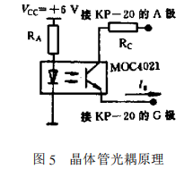 只需取下圖1所示的D1和D2兩個(gè)二極管,然后接到MOC4021光電隔離器的二極管側(cè),另外2個(gè)端點(diǎn)按圖5所示接到晶閘管的控制極G和陽極A上。Rc及Rx的參數(shù)設(shè)計(jì)如下: